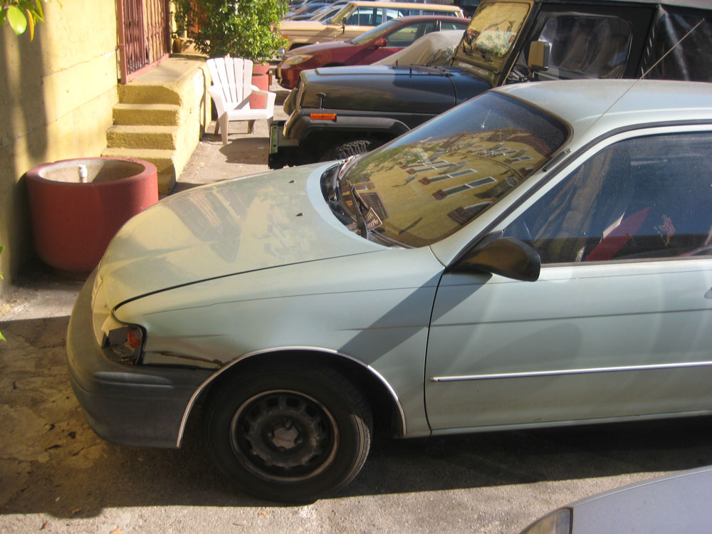 Évidemment j'ai pas acheté une voiture très luxueuse. D'ailleurs, d'après le taux de cours actuel du dollar, elle vaut à peine plus que les scooters que j'ai détruits. 1219$, tous frais et taxes compris. A ce prix là j'ai une magnifique Toyota qui a été mise en circulation alors que je rentrais en CM1, et qui a déjà parcouru l'équivalent de six fois et demie le tour de la terre. Je passe en plein phares quand je mets mon cligno à gauche, je dois rentrer par la porte passager et il n'y a pas de rétro à droite - pratique dans une ville quadrillée de freeways - mais je l'aime bien et si elle ne me lâche pas pendant mon séjour ici, on va bien s'entendre.