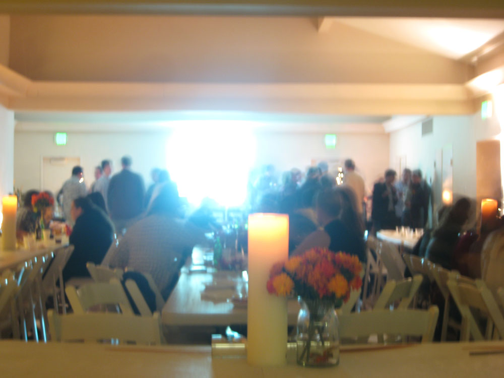 La soirée a lieu dans une grande salle floue. Donc non, ce n'est pas la photo et ses 5s d'exposition mais bien la salle qui est floue. Pour 5$ et une bouteille de vin on prend part au banquet et on se gave de dinde, de viande et de pumpkin pie.